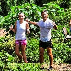 After the swim there was a nice trail run with only a couple of puddles and a few hay bale hurdles to include a run through the ‘WAR ZONE’. OOOOOHHHH….we thought we were going to get it bad, we actually wore white so we would get it bad, but…nothing. Not a single Paint Ninja anywhere. SOOOO disappointing. Oh well, we kept running and a real nice pace. Sarah is has ridiculous stamina and while I was right on her tail the whole time, I was starting to feel it, luckily we hit another line for another tree crossing. This one was elevated over the river. We crossed that with ease and headed through another long trail run, through the war zone again, and with the same result, no Paint Ninjas, right into the one and only mud obstacle where our shoes got muddy, and it sprayed a little on our legs, but that was it. We crossed the finish line and went to the beer line.