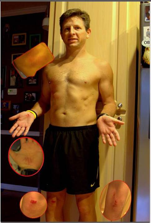 I hope everyone does laugh because it is funny. Here I am, Ironman, Running Coach and motivator, on the ground bleeding for a full 10 seconds. What makes it even more funny, is that I teach two major aspects when I coach form. First is to raise your knees in order to make you lighter like a gazelle, second is to look five feet in front of you. Well,obviously if I was actually following my own advice this wouldn’t have happened. (Pause for more laughs)